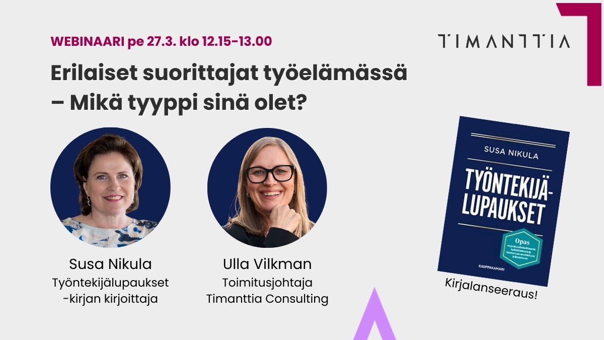 Webinaarissa tarkastelemme työelämän erilaisia suorittajatyyppejä ja samalla juhlistamme Susa Nikulan uuden odotetun kirjan, Työntekijälupaukset, julkistusta!